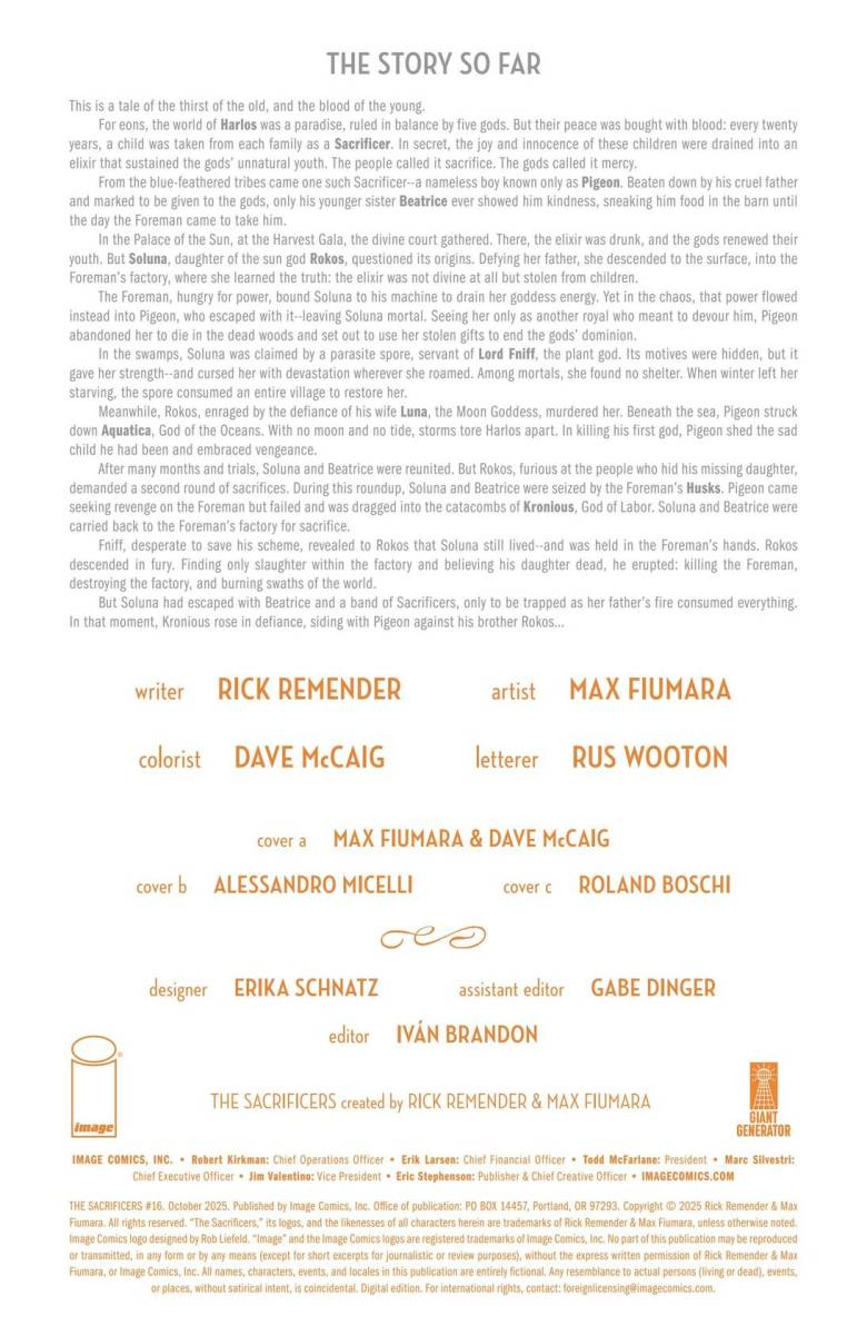 The Sacrificers #16 (2025) : The gods’ war reaches its final, devastating crescendo. In the ashes of rebellion, only one truth remains: when the gods fall, everything changes forever.