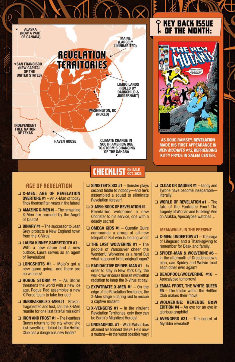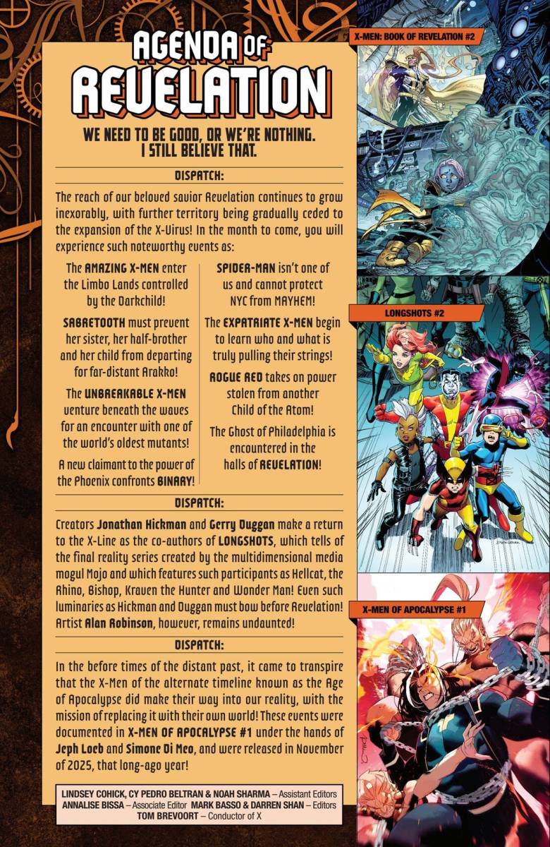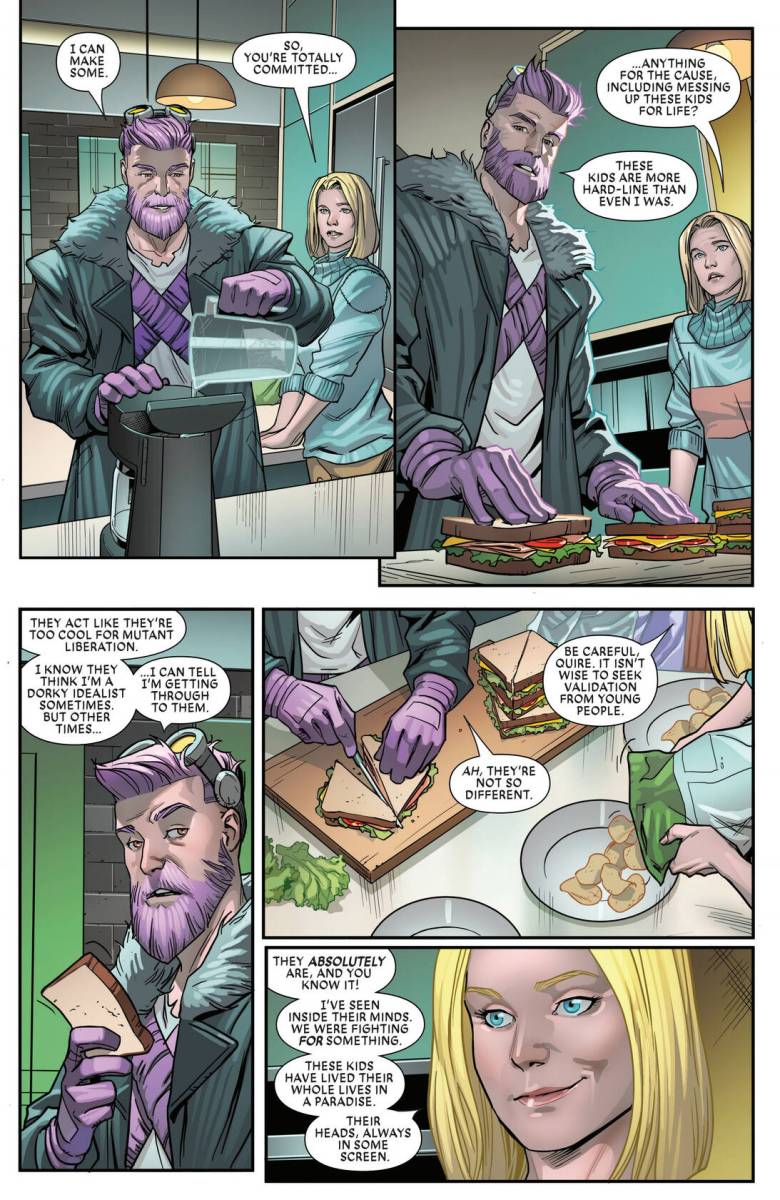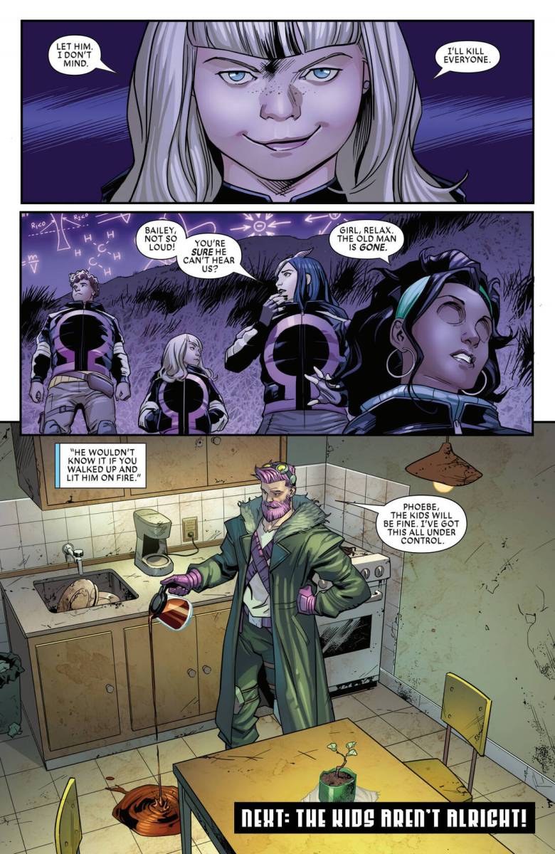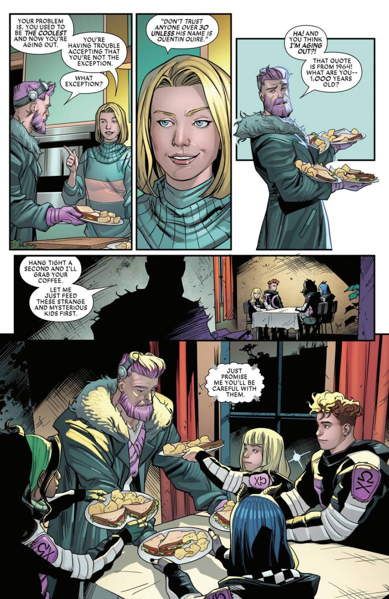 Omega Kids #1 (2025) : KID OMEGA’S ALL GROWN UP! X YEARS LATER, Quentin Quire protects the dream of mutant supremacy and independence as head of the Revelation Territories’ spy network. But when a conspiracy threatens the mutant utopia, Quire and his psychic students will have to distinguish friend from foe. Has Quentin got what it takes to carry the dream forward, or will the next generation replace the former revolutionary?